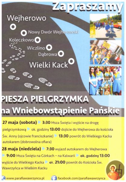 Tradycyjnie na Uroczystość Wniebowstąpienia Pańskiego, 27 i 28 maja, wyrusza dekanalna piesza pielgrzymka do Wejherowa. Wyjście w sobotę 27 maja o godz. 3.30 z kościoła Św. Wawrzyńca. Zachęcamy do wzięcia udziału w pielgrzymce, która jest okazją do dosłownego podjęcia wezwania obecnego roku duszpasterskiego "Idźcie i głoście".