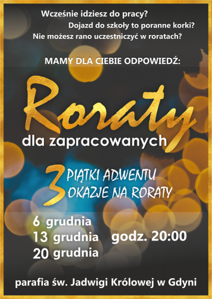 i teraz, serdecznie zapraszamy na roraty dla zapracowanych i zabieganych. Odbywać się będą przez trzy piątki adwentu: 6, 13 i 20 grudnia. Msza św. rozpoczyna się o godz. 20.00 w kaplicy.