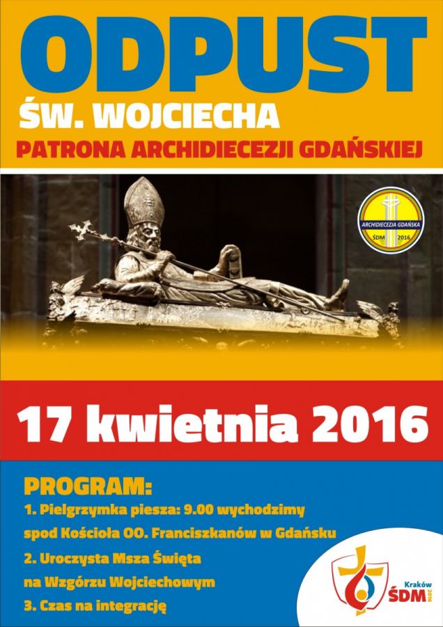 Piesza Pielgrzymka Młodych do Diecezjalnego Sanktuarium w Św. Wojciechu odbędzie się 17 kwietnia 2016 r. Miejscem zbiórki jest plac przed kościołem Świętej Trójcy w Gdańsku (OO. Franciszkanie). Zbiórka o godz. 8.45. Wspólne wyjście o godz. 9.00. Po dojściu pielgrzymki na Wzgórze Św. Wojciecha będzie o godz. 12.00 uroczysta Msza Święta odpustowa, w czasie której odnowimy nasze przyrzeczenia chrzcielne z okazji 1050 Rocznicy Chrztu Polski.